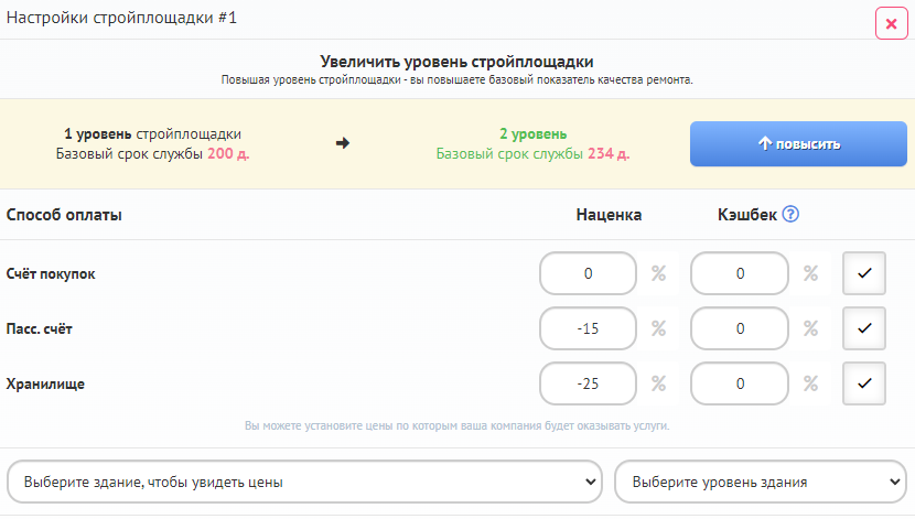 Оплата повышения уровня выполняется с основного счета строительной компании. Убедитесь, что на счету вашей компании достаточно средств для повышения уровня.