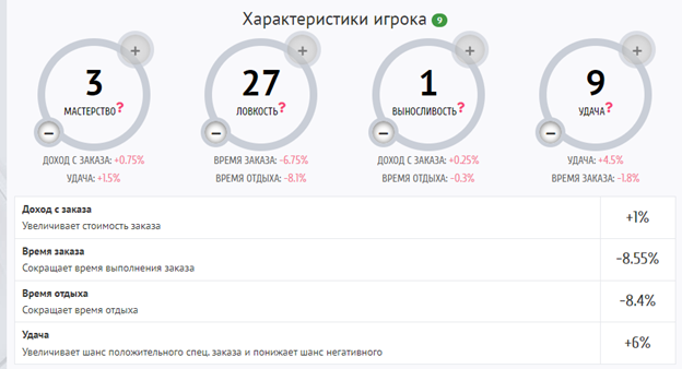 За каждый новый уровень даётся 2 очка характеристик, которые вы можете распределить на своё усмотрение. Оплата за улучшения списывается со счета покупок.