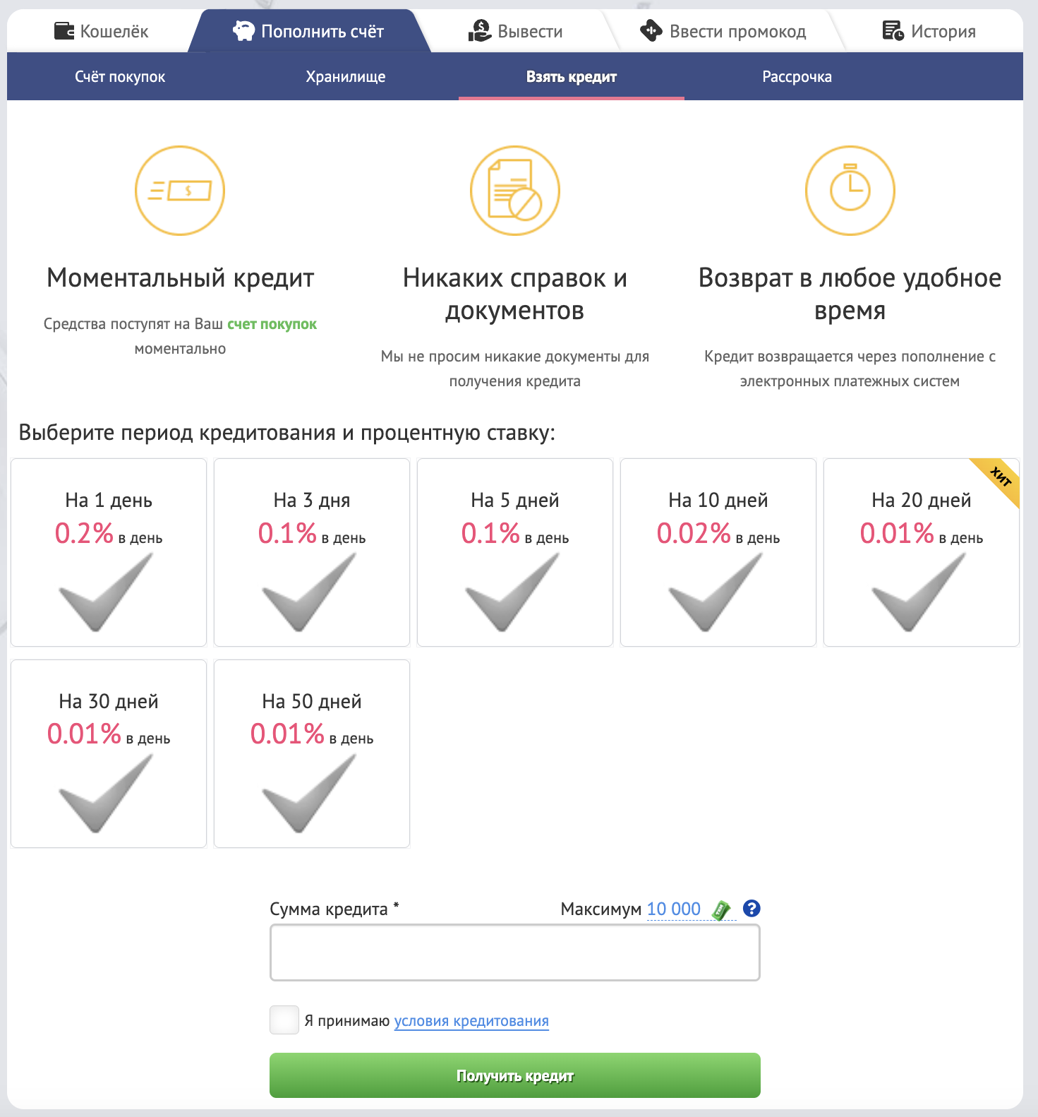 Кредит предоставляется пользователям пополнившим баланс не менее чем на 100 ТХМ. Кредит можно взять на сумму, которая в 4 раза превышает сумму пополнений.