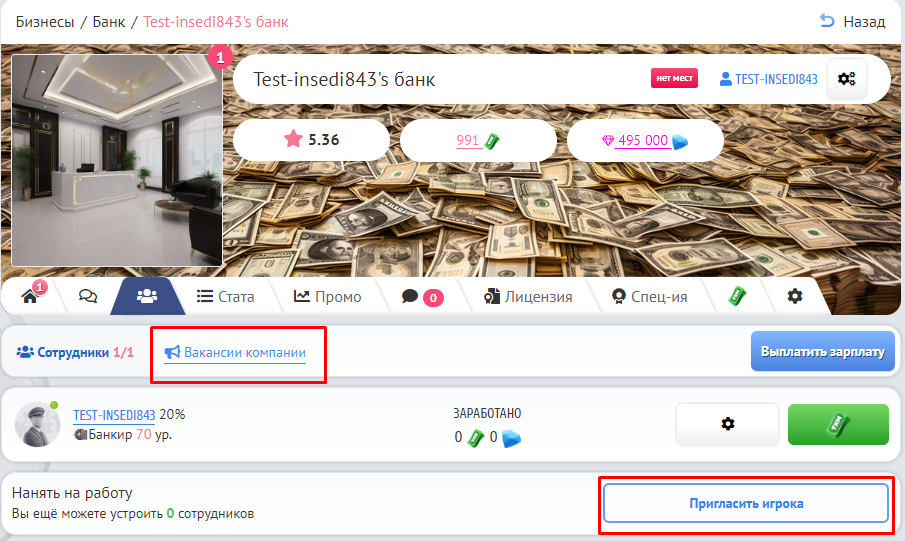 Create a job vacancy or send a personal invitation to a player! You can do this on the business page, under the "employees" tab.