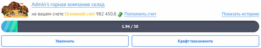 Если Вам необходимо пополнить основной счёт компании или вывести с него деньги на Ваши личные счета, а также — пополнить счёт кристаллов компании, воспользуйтесь вкладкой «Счёт». Также в этой вкладке отображается информация о состоянии склада Вашей горной компании. Работа со складом компании аналогична работе с личным складом руды.