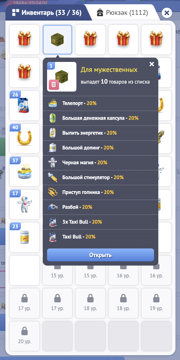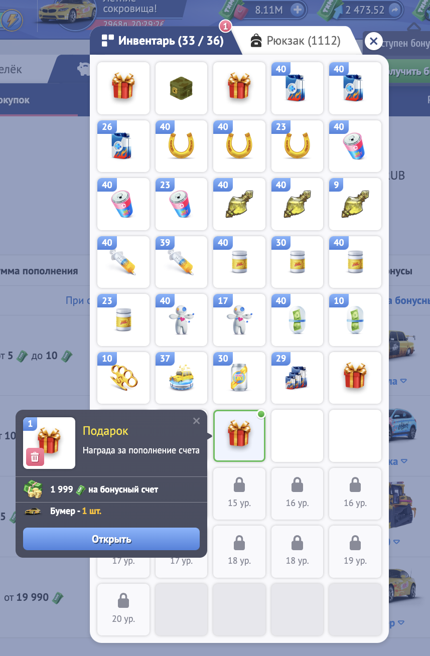 Все предметы, которые Вы получаете в игре отправляются в инвентарь. Например, получив такси в подарок за депозит, Вы увидите его в инвентаре