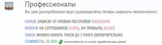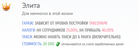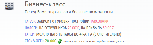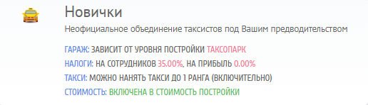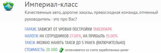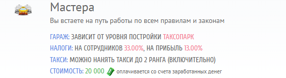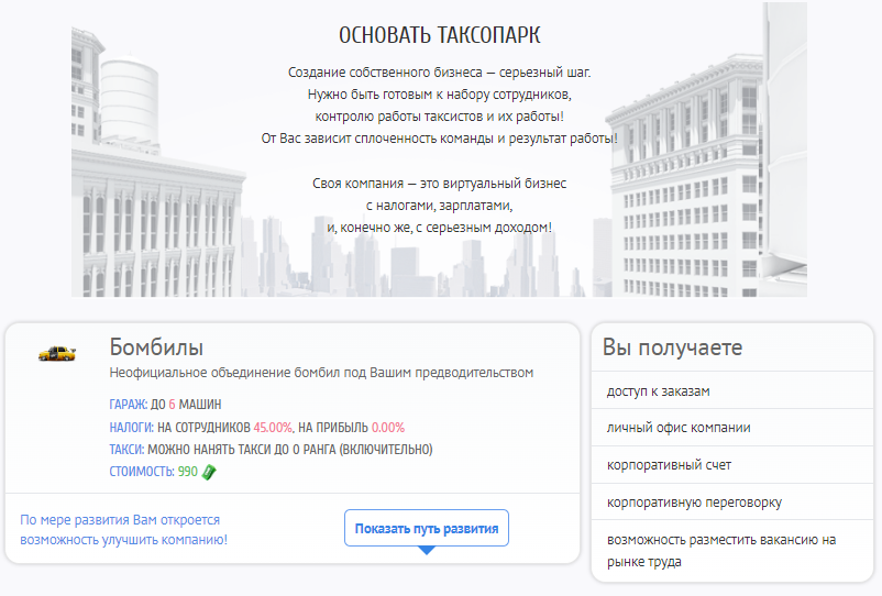 Você pode começar a desenvolver sua empresa a partir do nível "bomber" - apenas pedidos de nível zero e um carro inicial "bomber", ou a partir do nível "novato", onde você terá acesso a pedidos e carros de nível 1. O único requisito adicional para o nível "novato" é a presença de um prédio de estacionamento de táxis na política.