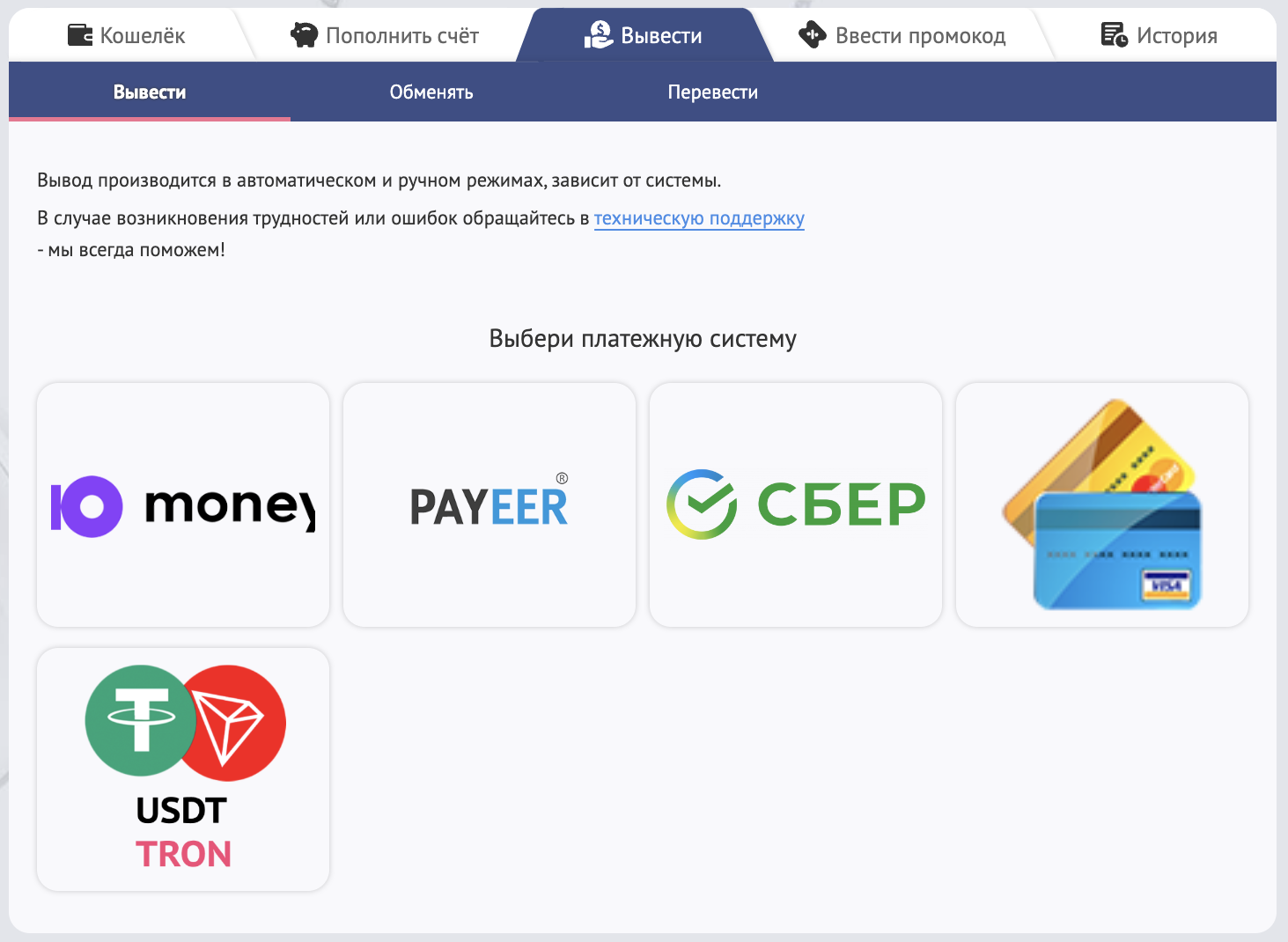 To withdraw funds, select a payment system and follow the instructions. If you encounter difficulties or errors, please contact technical support – we are always here to help!